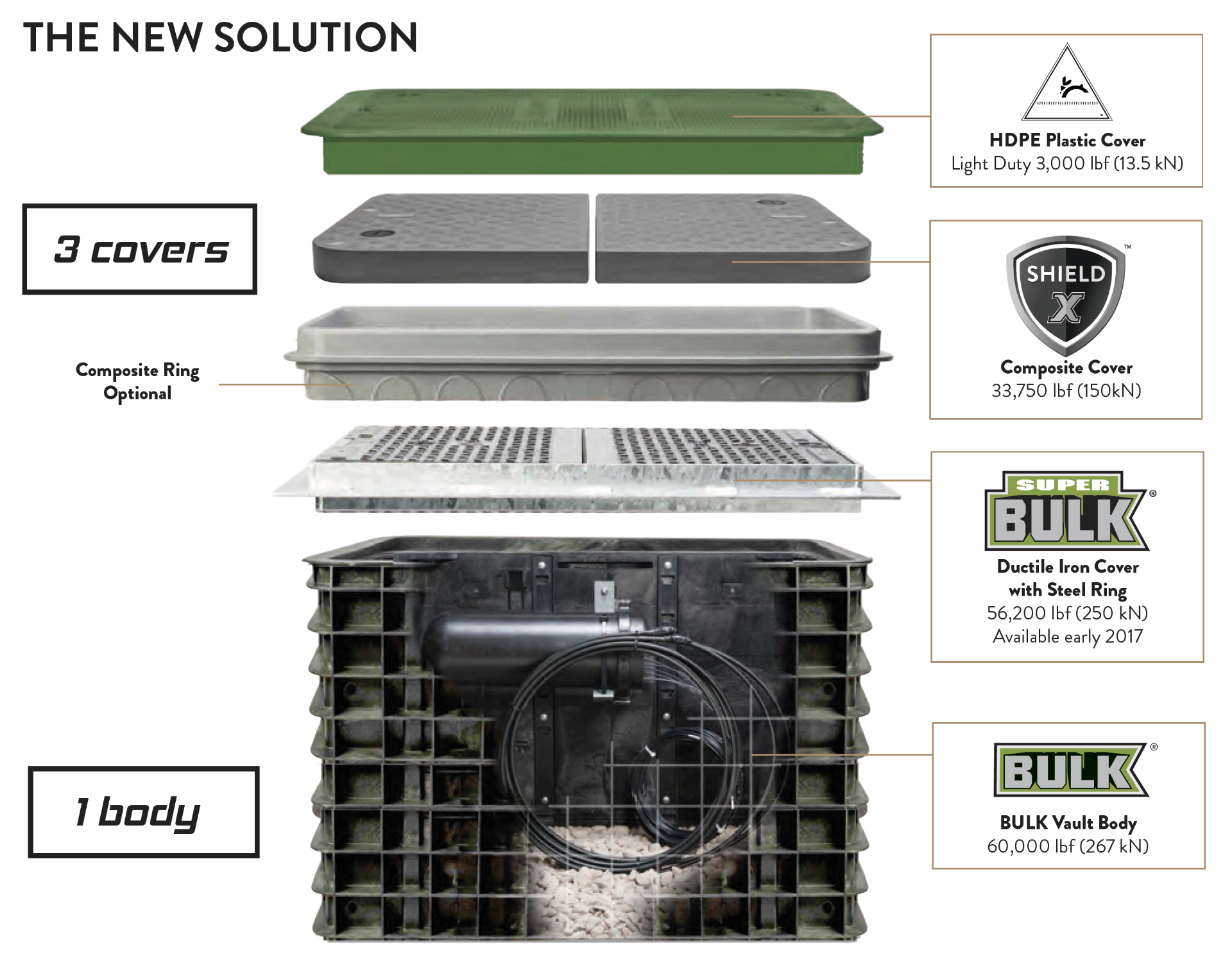 An upgradable, re-enterable cable management vault system series, BULK redefines the standard with one universal body that can easily meet the standards of light, medium, and heavy duty applications simply by changing its cover or ring design.
