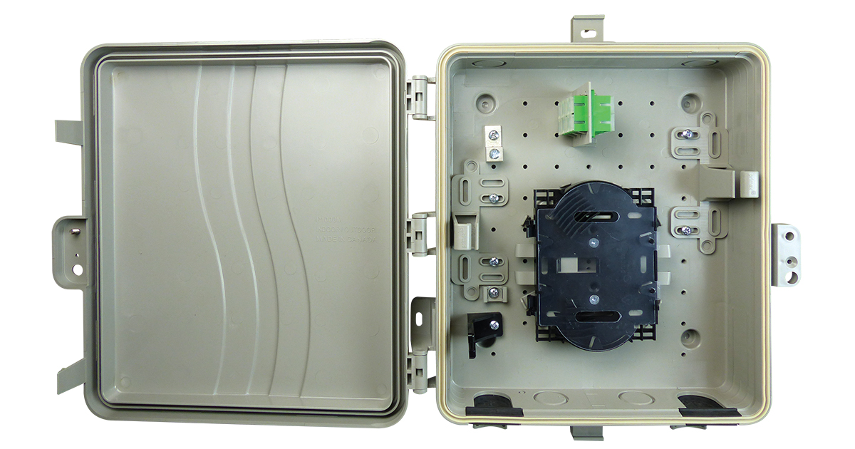• Low-profile splice and connect enclosure with storage for up to six fibers in FTTH MDU applications.