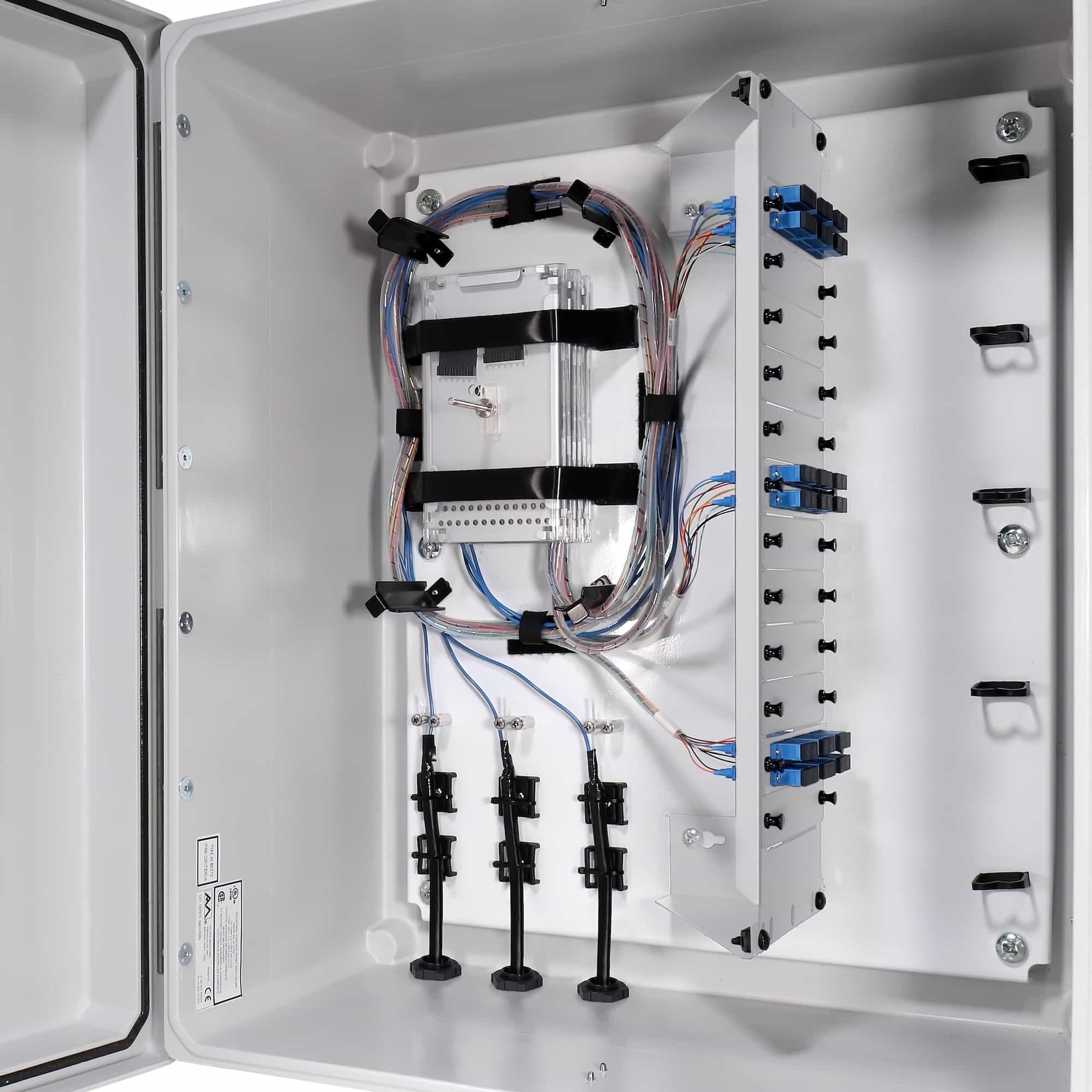 This outdoor fiber solution is enclosed in a NEMA 4X, UL Listed, non-corrosive, non-conductive, light weight, and easy to modify fiberglass enclosure. It’s especially well suited for extreme temperatures and corrosive environments. It can be wall mounted with its included mounting feet or pole mounted with an optional pole mount kit. It is secured by two pad lockable snap latches.