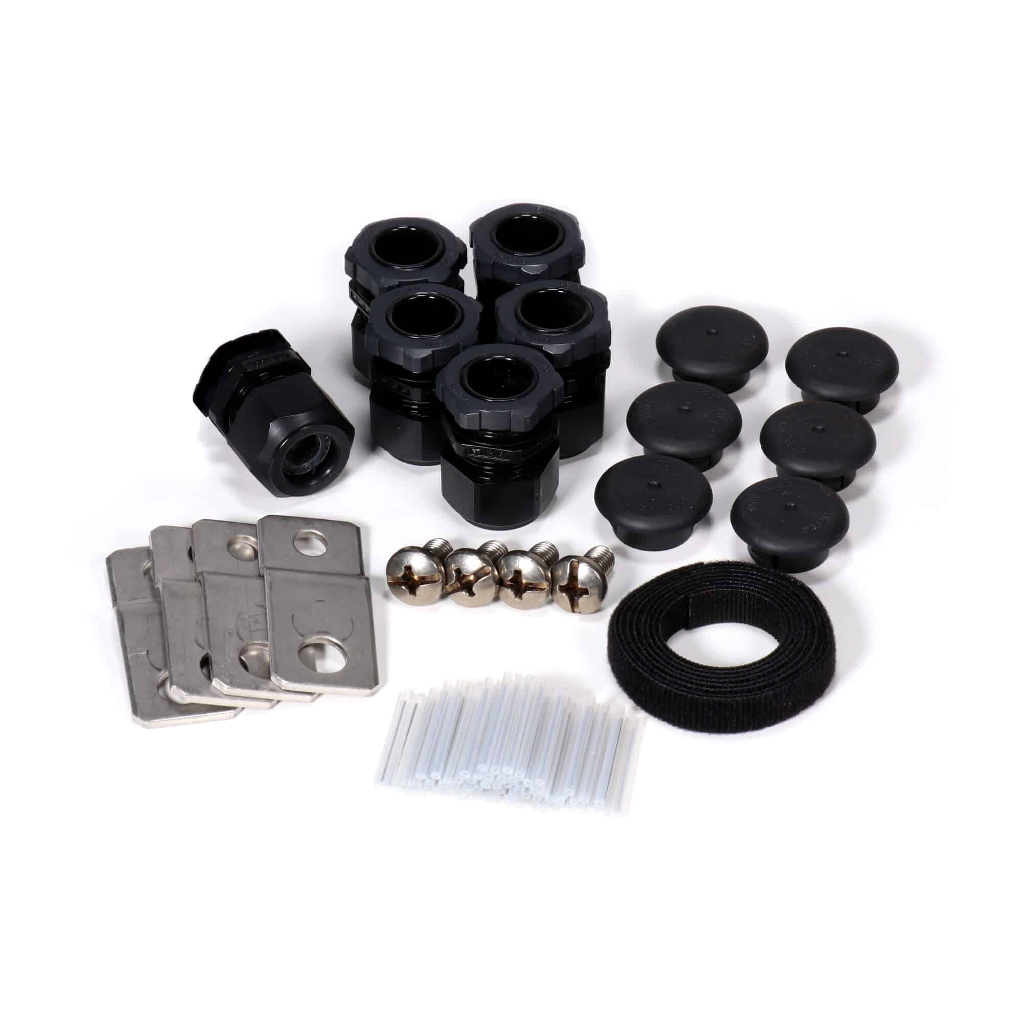It comes standard with 12 fiber adapter plate slots, fiber management cable guides, fiber splice trays, splice sleeves, document holder, distribution chart, cable mounting tiedowns, and Velcro® straps for securing splice trays and fiber cable. The included accessory kit contains liquid tight break through plugs and cord grips, together with fiber strength member clamps allowing for the safe entrance and exit of fiber optic cable.
