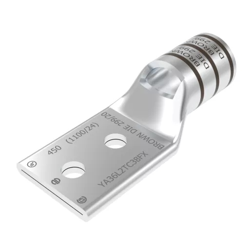 Burndy YA36L2TC38FX, Compression Terminal, 500 kcmil G,H, 444 DLO, Cu, 2-Hole, 3/8″ Stud, 1″ Spacing, Standard Barrel